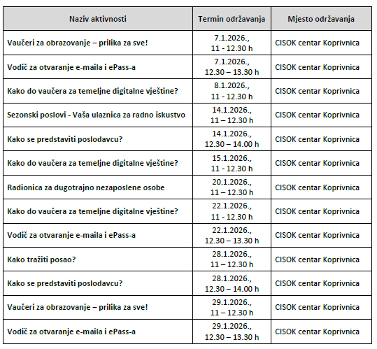 Za sudjelovanje na svakoj radionici molimo prijavite se kod svog savjetnika za zapošljavanje (nezaposlene osobe) ili u CISOK centru (osobno, telefonski na broj 048/853 771 ili putem e-maila cisok-koprivnica@hzz.hr).