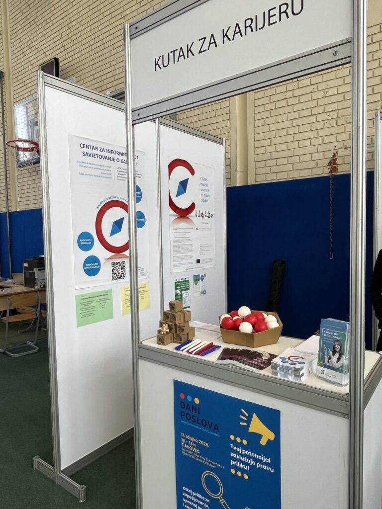 U srijedu, 11. ožujka 2026., u prostoru sportske dvorane Ekonomske i trgovačke škole Čakovec, prisustvovali smo na Danima poslova koje je organizirao Hrvatski zavod za zapošljavanje PU Čakovec. CISOK Čakovec je u svom "Kutku za karijeru" putem informativno-promotivnog štanda posjetiteljima prezentirao široki spektar svojih usluga, a obradovali smo ih i pokojim promotivnim materijalom.